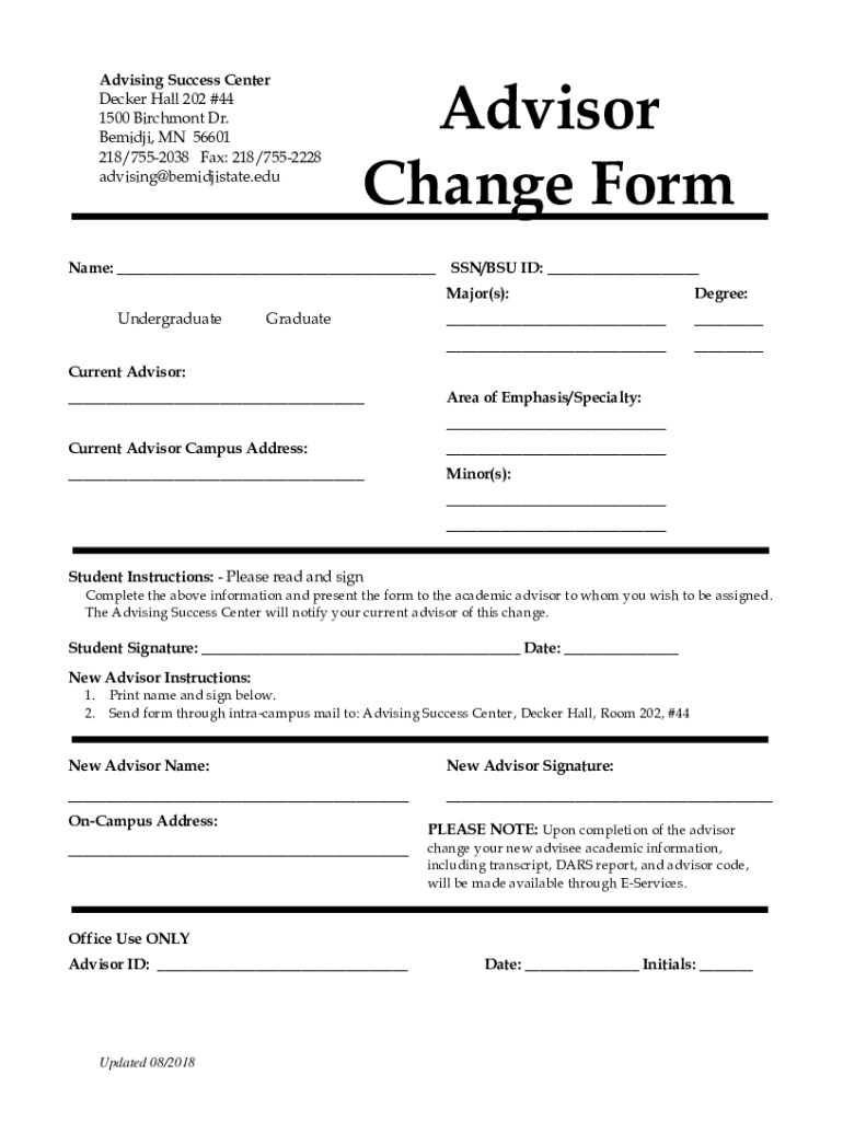 Advising Success Center Decker Hall 202 #44 1500 Richmond Dr. Besides, MN 56601 218/7552038 Fax: 218/7552228 advising bemidjistate. Advisor Change Forename: SSN/BSU ID: UndergraduateGraduateMajor(s):Degree: