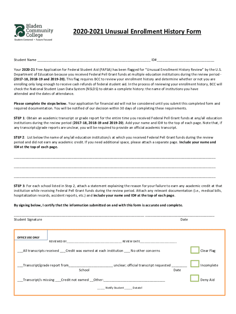 20202021 Unusual Enrollment History FormStudent Name ID# Your 202021 Free Application for Federal Student Aid (FAFSA) has been flagged for Unusual Enrollment History Review by the U.S. Department