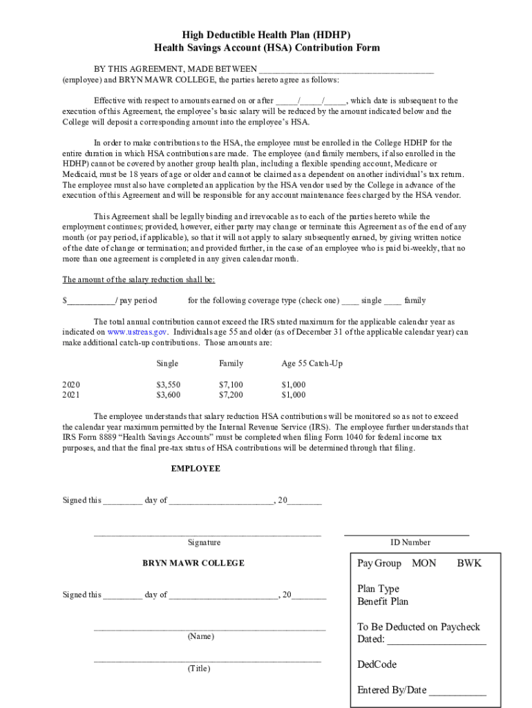 High Deductible Health Plan (DHP) Health Savings Account (HSA) Contribution Form BY THIS AGREEMENT, MADE BETWEEN (employee) and BRYAN MAR COLLEGE, the parties hereto agree as follows: Effective with