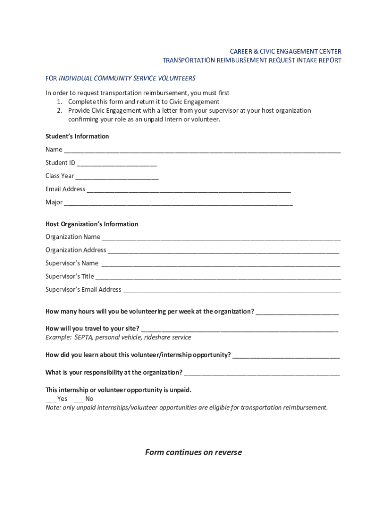 CAREER & CIVIC ENGAGEMENT CENTER TRANSPORTATION REIMBURSEMENT REQUEST INTAKE REPORT FOR INDIVIDUAL COMMUNITY SERVICE VOLUNTEERS In order to request transportation reimbursement, you must first 1.