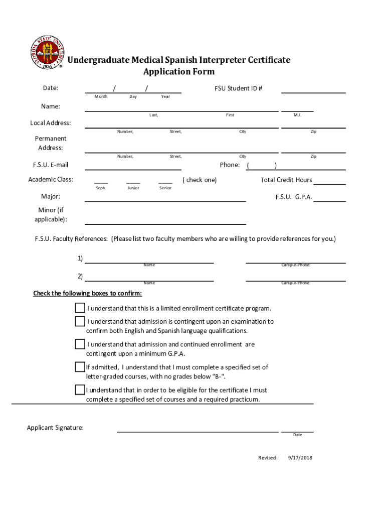 Undergraduate Medical Spanish Interpreter Certificate Application Form Date:/ Month FSU Student ID #/ DayYearName: Last, First. I. Local Address: Number, Street, CityZipNumber, Street, CityZipPermanent