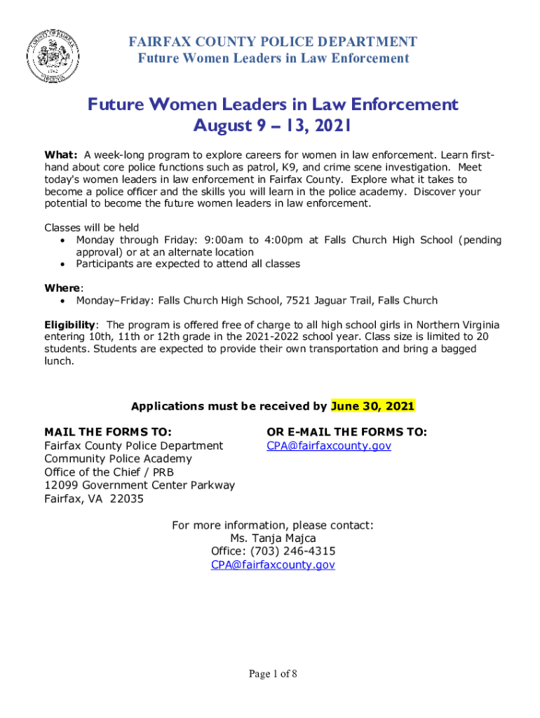 FAIRFAX COUNTY POLICE DEPARTMENT Future Women Leaders in Law EnforcementFuture Women Leaders in Law Enforcement August 9 13, 2021 What: A weeklong program to explore careers for women in law enforcement.