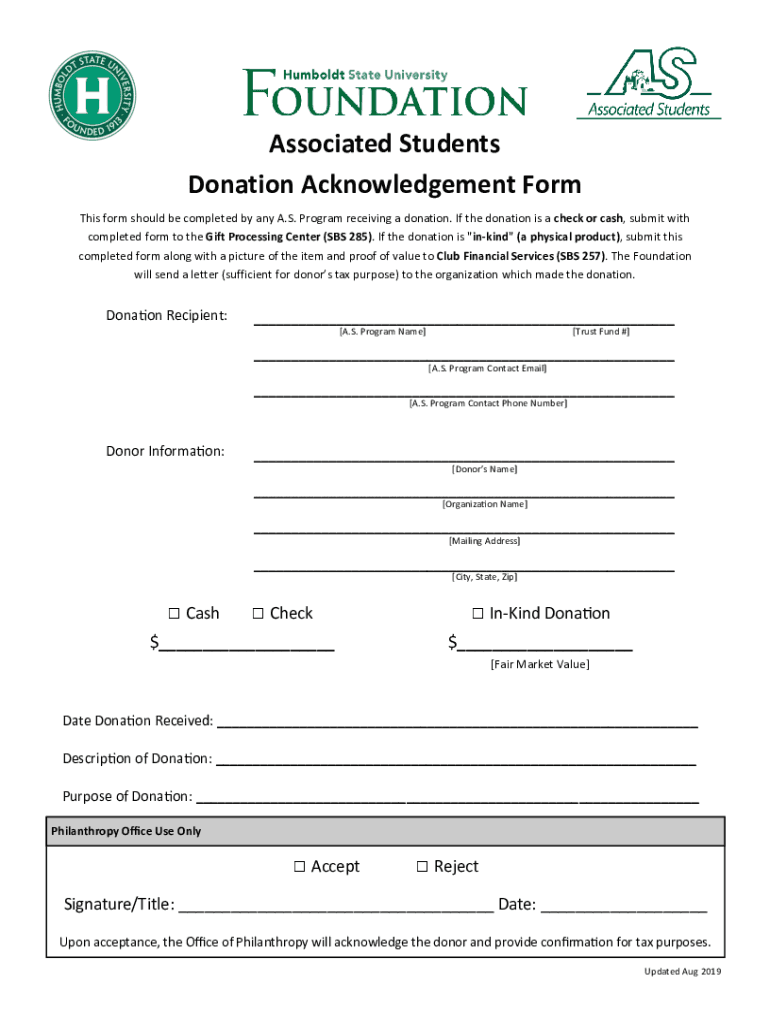 Associated Students Donation Acknowledgement Form This form should be completed by any A.S. Program receiving a donation. If the donation is a check or cash, submit with completed form to the Gift