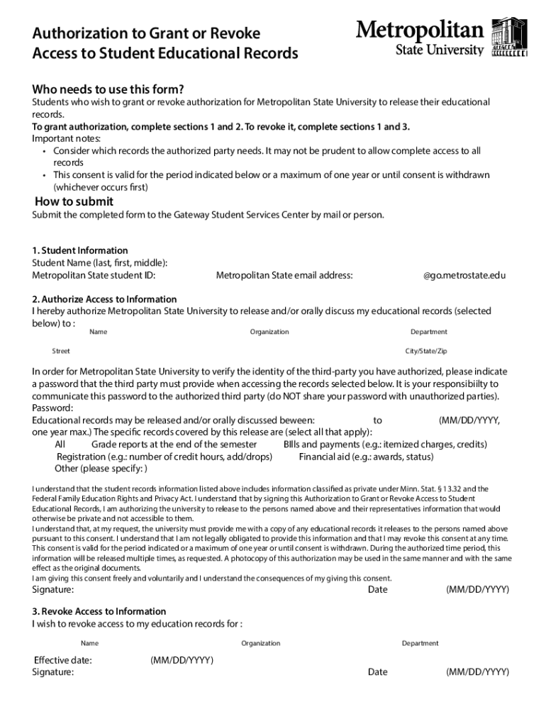 Who needs to use this form? Students who wish to grant or revoke authorization for Metropolitan State University to release their