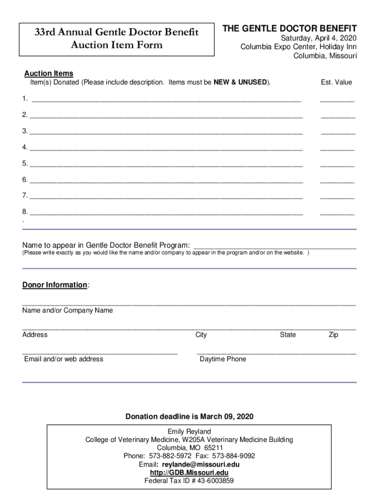 33rd Annual Gentle Doctor Benefit Auction Item Forth GENTLE DOCTOR BENEFIT Saturday, April 4, 2020, Columbia Expo Center, Holiday Inn Columbia, MissouriAuction Items Item(s) Donated (Please include