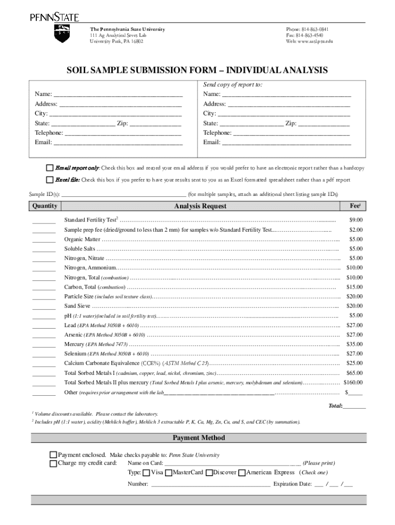 The Pennsylvania State University 111 Ag Analytical Serves Lab University Park, PA 16802Phone: 8148630841 Fax: 8148634540 Web: www.aasl.psu.eduSOIL SAMPLE SUBMISSION FORM INDIVIDUAL ANALYSIS Name: