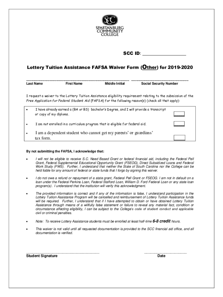 SCC ID: Lottery Tuition Assistance FAFSA Waiver Form (Other) for 20192020 Last NameFirst NameMiddle InitialSocial Security Number request a waiver to the Lottery Tuition Assistance eligibility requirement