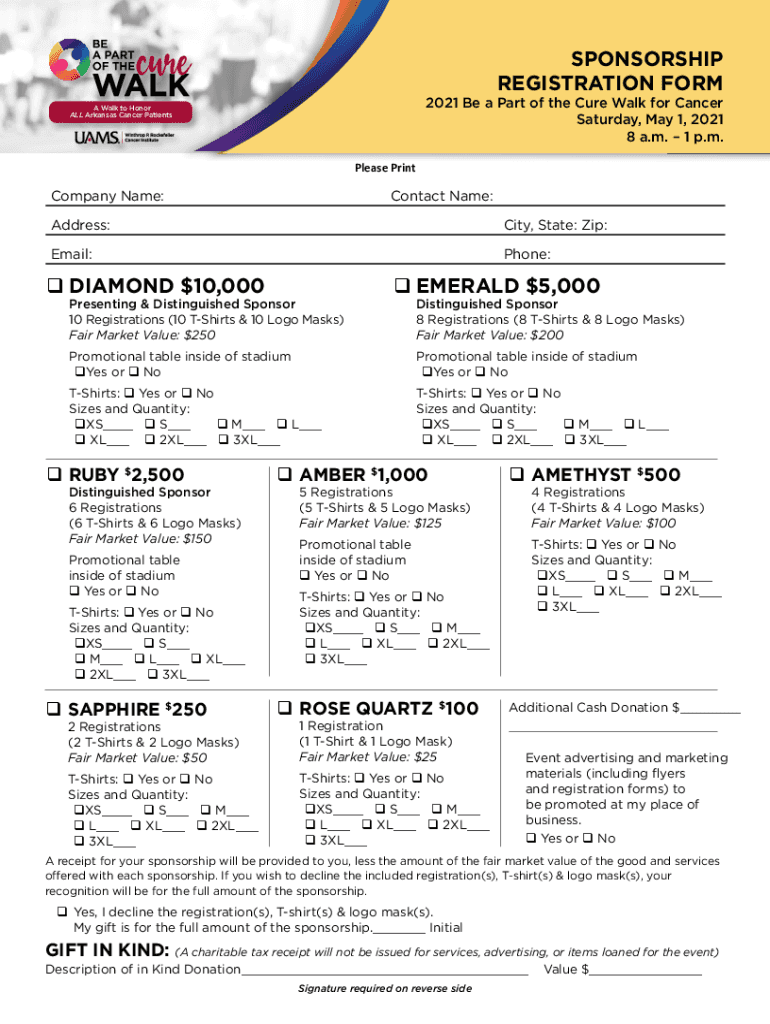 SPONSORSHIP REGISTRATION FORM 2021 Be a Part of the Cure Walk for Cancer Saturday, May 1, 2021 8 a.m. 1 p.m. A Walk to Honor ALL Arkansas Cancer PatientsPlease PrintCompany Name:Contact Name:Address:City,