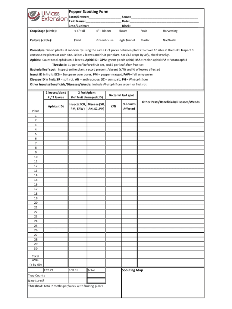 Pepper Scouting Former Stage (circle): Culture (circle):Farm/Grower: Scout: Field Name: Date: Crop/Cultivar: Block: 6 tall 6 Bloom Fruit HarvestingFieldGreenhouseHigh TunnelPlasticNo PlasticProcedure:
