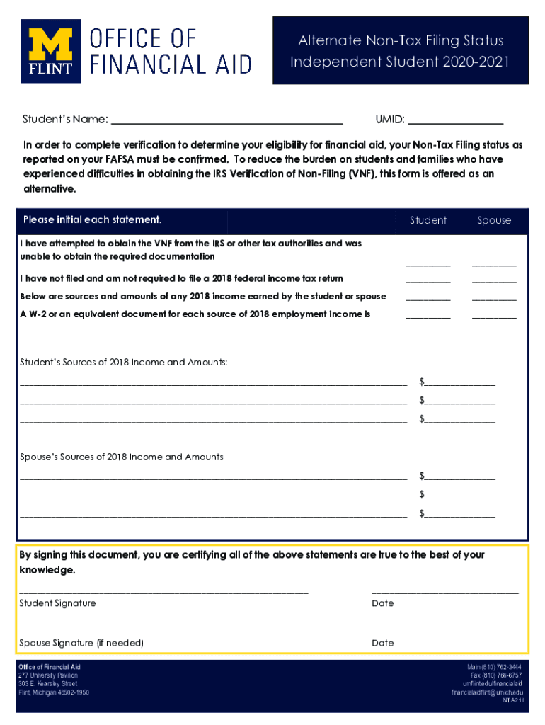 Get the free Alternate Non-Tax Filing Status Independent Student 2020-2021