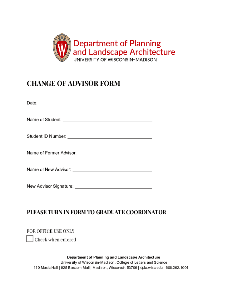 CHANGE OF ADVISOR FORM Date: Name of Student: Student ID Number: Name of Former Advisor: Name of New Advisor: New Advisor Signature: PLEASE TURN IN FORM TO GRADUATE COORDINATOR FOR OFFICE USE ONLY