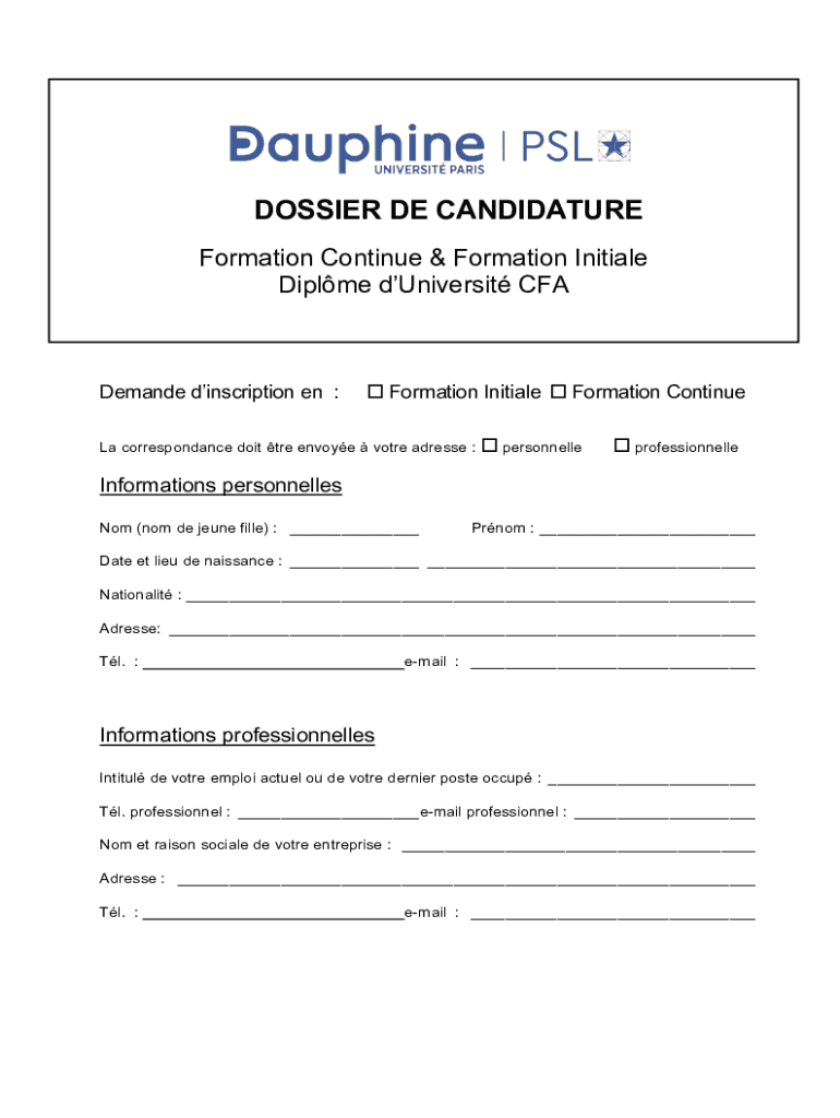 DOSSIER DE CANDIDATURE Formation Continue & Formation Initial Diploma university CFADemande inscription en :o Formation Initial o Formation Continue La correspondence dot TRE envoy vote address :