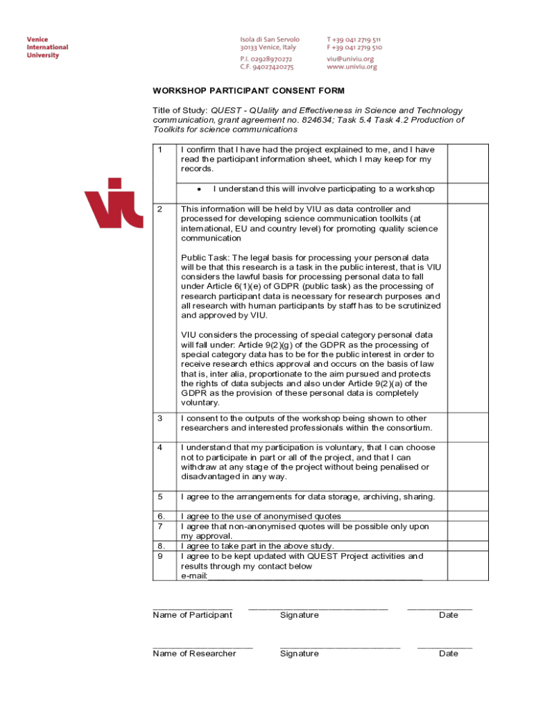 WORKSHOP PARTICIPANT CONSENT FORM Title of Study: QUEST Quality and Effectiveness in Science and Technology communication, grant agreement no. 824634; Task 5.4 Task 4.2 Production of Toolkits for