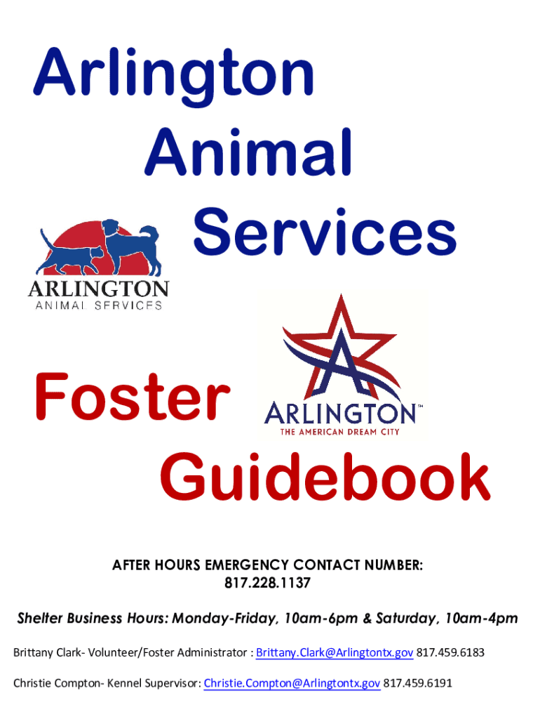Arlington Animal Services Foster Guidebook AFTER HOURS EMERGENCY CONTACT NUMBER: 817.228.1137 Shelter Business Hours: Monday Friday, 10am6pm & Saturday, 10am4pm Brittany Clark Volunteer/Foster Administrator