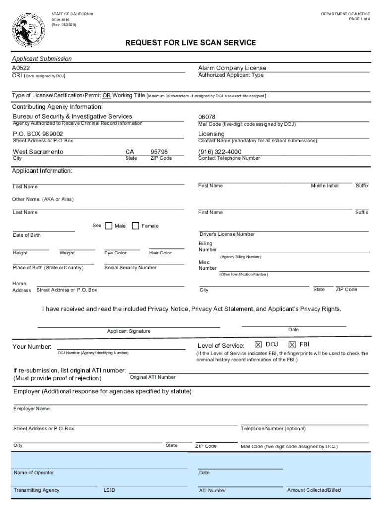STATE OF CALIFORNIA CIA 8016 (Rev. 04/2020)DEPARTMENT OF JUSTICE PAGE 1 of 4REQUEST FOR LIVE SCAN SERVICE Applicant Submission Alarm Company LicenseA0522Authorized Applicant Type ORI (Code assigned