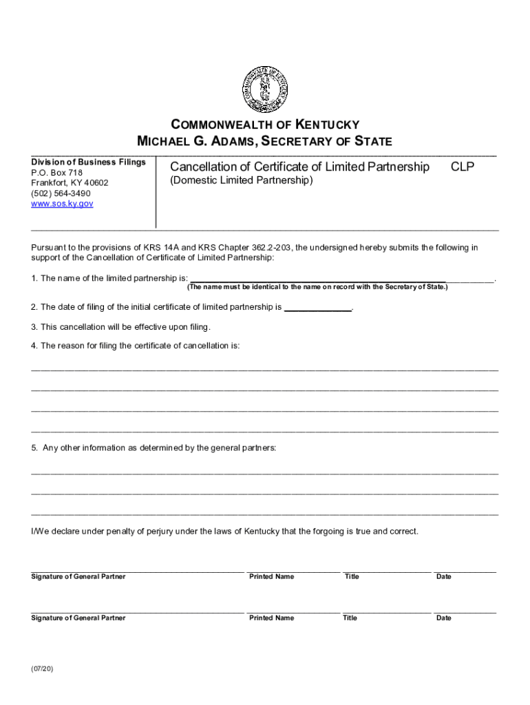 COMMONWEALTH OF KENTUCKY MICHAEL G. ADAMS, SECRETARY OF STATE Division of Business Filings P.O. Box 718 Frankfort, KY 40602 (502) 5643490 www.sos.ky.govCancellation of Certificate of Limited Partnership