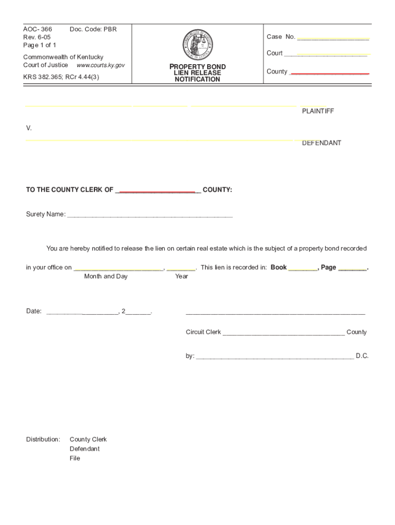 EA L TH OF KE Case No. Kyle et justitiaCourt RTCECOUCommonwealth of Kentucky Court of Justice www.courts.ky.govOF JUSTIPROPERTY BONDCounty LIEN RELEASE NOTIFICATIONS 382.365; RCR 4.44(3)NWCOMMODoc.
