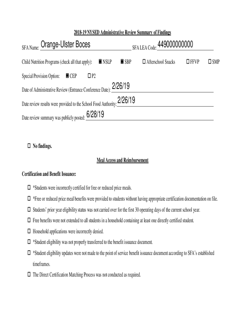 201819 NOSED Administrative Review Summary of FindingsOrangeUlster Bones 449000000000 SFA Name: SFA LEA Code: Child Nutrition Programs (check all that apply): Special Provision Option: CEP SLP SVP