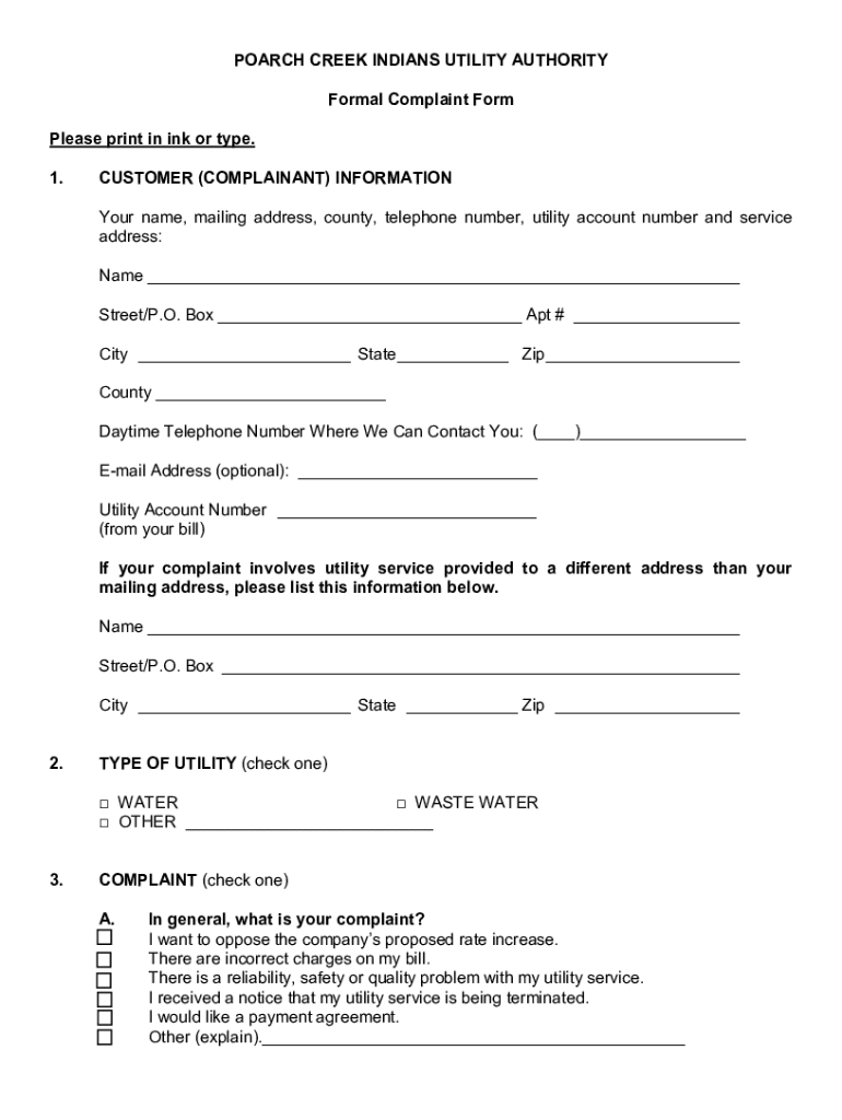 PORCH CREEK INDIANS UTILITY AUTHORITY Formal Complaint Form Please print in ink or type. 1.CUSTOMER (COMPLAINANT) INFORMATION Your name, mailing address, county, telephone number, utility account