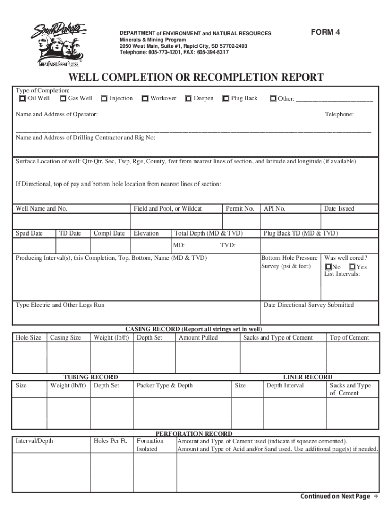 FORM 4DEPARTMENT of ENVIRONMENT and NATURAL RESOURCES Minerals & Mining Program 2050 West Main, Suite #1, Rapid City, SD 577022493 Telephone: 6057734201, FAX: 6053945317WELL COMPLETION OR COMPLETION