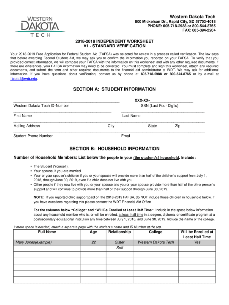 Western Dakota Tech 800 Michelson Dr., Rapid City, SD 577034018 PHONE: 6057182988 or 8005448765 Faxes: 605394220420182019 INDEPENDENT WORKSHEET V1 STANDARD VERIFICATION Your 20182019 Free Application
