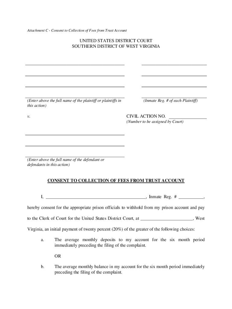 Attachment C Consent to Collection of Fees from Trust AccountUNITED STATES DISTRICT COURT SOUTHERN DISTRICT OF WEST VIRGINIA(Enter above the full name of the plaintiff or plaintiffs in this action)(Inmate