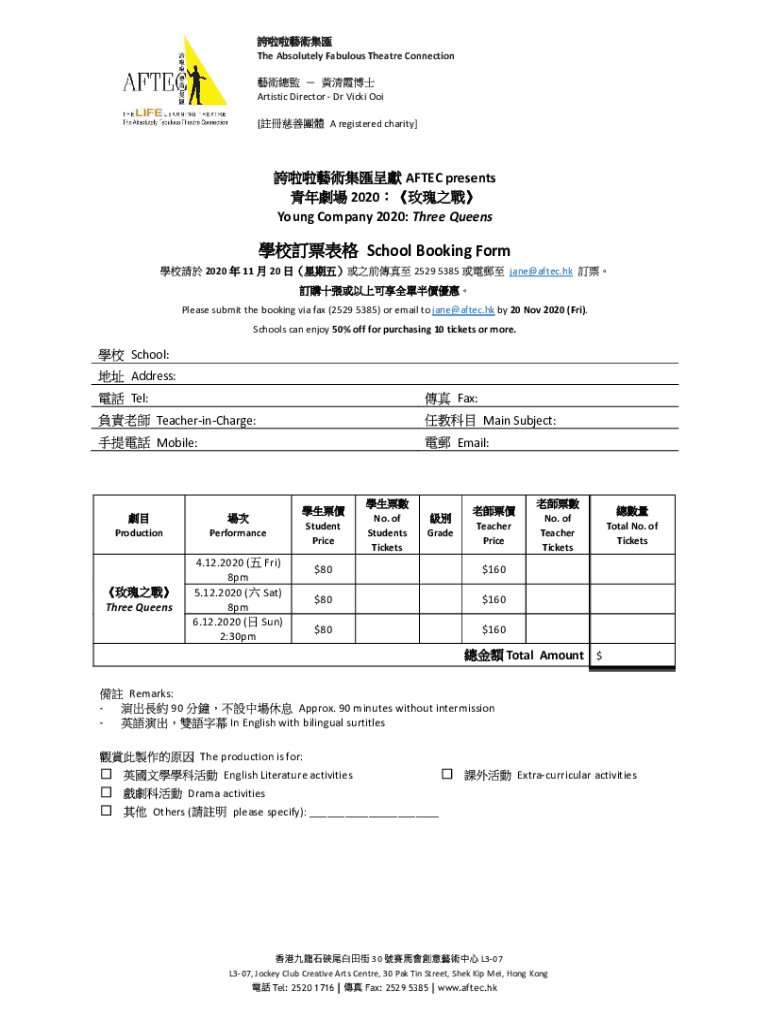 The Absolutely Fabulous Theater Connection Artistic Director Dr Vicki OSI A registered charity AFTER presents 2020 Young Company 2020: Three QueensSchool Booking Form 202011202529 5385jane after.