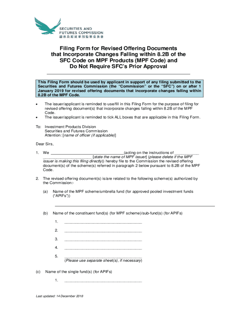 Filing Form for Revised Offering Documents that Incorporate Changes Falling within 8.2B of the SFC Code on MPH Products (MPH Code) and Do Not Require SFC's Prior Approval This Filing Form should be