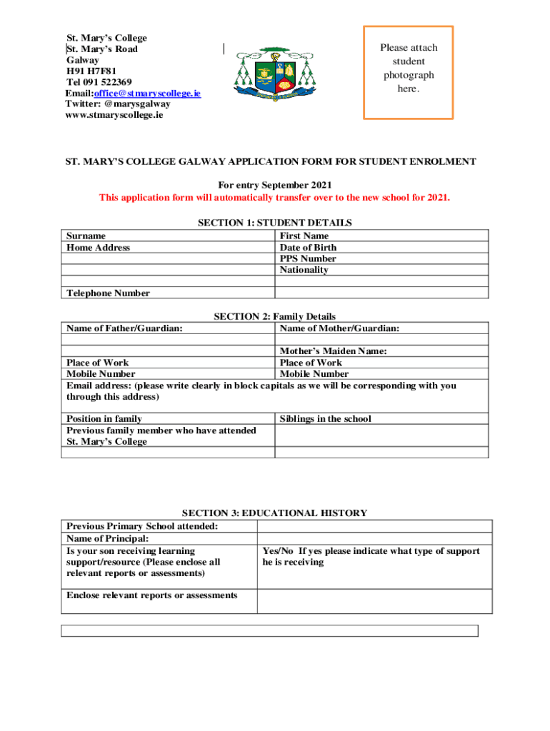 St. Mary's College St. Mary's Road Galway H91 H7F81 Tel 091 522369 Email:office stmaryscollege.i.e. Twitter: marysgalway www.stmaryscollege.iePlease attach student photograph here.ST. MARY COLLEGE