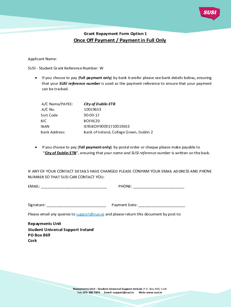 Grant Repayment Form Option 1Once Off Payment / Payment in Full OnlyApplicant Name: SCSI Student Grant Reference Number: W If you choose to pay (full payment only) by bank transfer please see bank