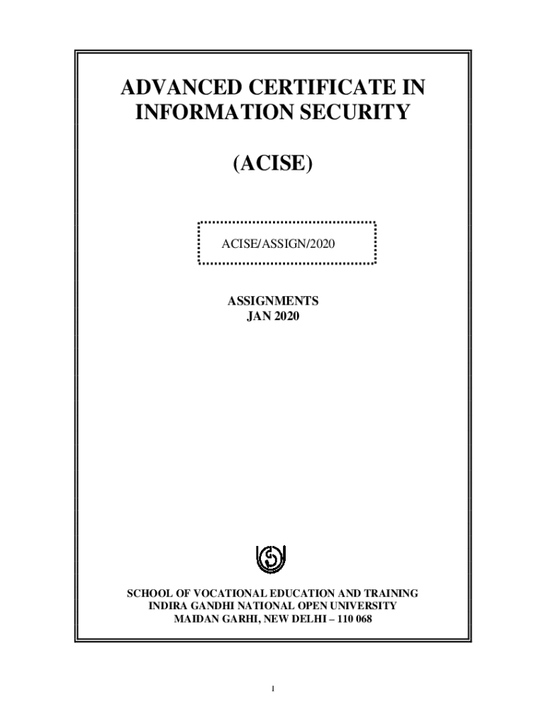 ADVANCED CERTIFICATE IN INFORMATION SECURITY (ARISE)ARISE/ASSIGN/2020ASSIGNMENTS JAN 2020SCHOOL OF VOCATIONAL EDUCATION AND TRAINING INDIRA GANDHI NATIONAL OPEN UNIVERSITY MAIDAN GAR HI, NEW DELHI