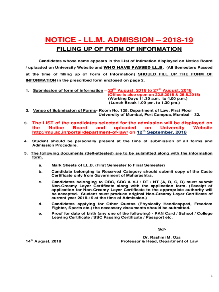 NOTICE LL.M. ADMISSION 201819 FILLING UP OF FORM OF INFORMATION Candidates whose name appears in the List of Intimation displayed on Notice Board / uploaded on University Website and WHO HAVE PASSED
