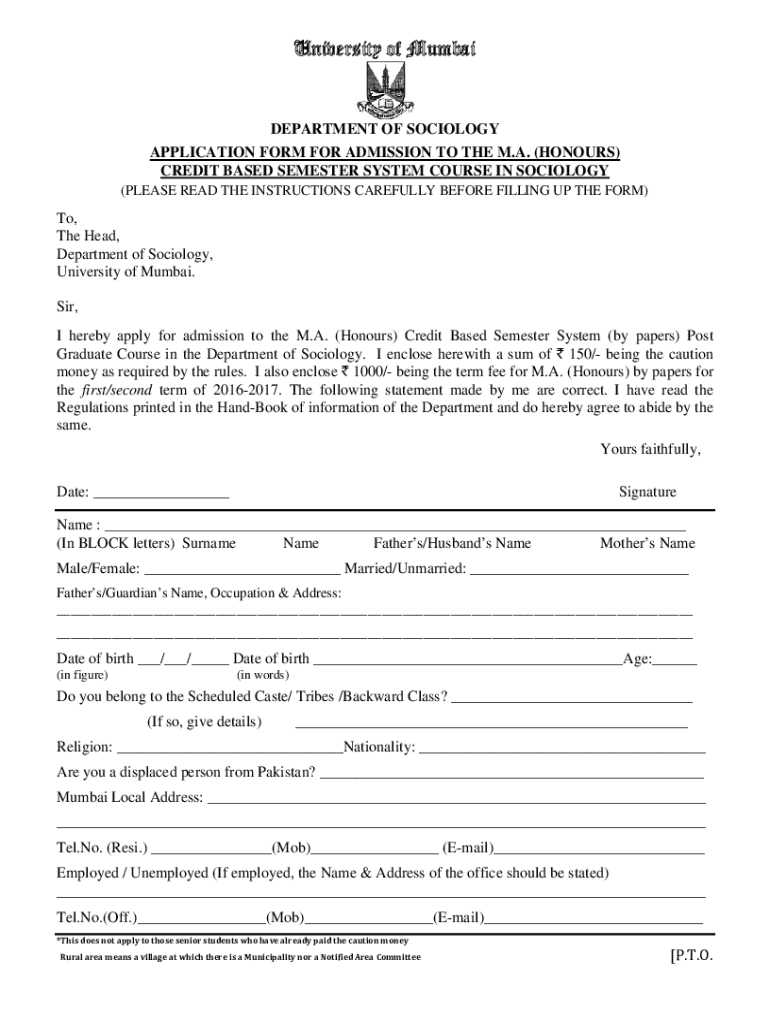 University of MumbaiDEPARTMENT OF SOCIOLOGY APPLICATION FORM FOR ADMISSION TO THE M.A. (Honors) CREDIT BASED SEMESTER SYSTEM COURSE IN SOCIOLOGY (PLEASE READ THE INSTRUCTIONS CAREFULLY BEFORE FILLING