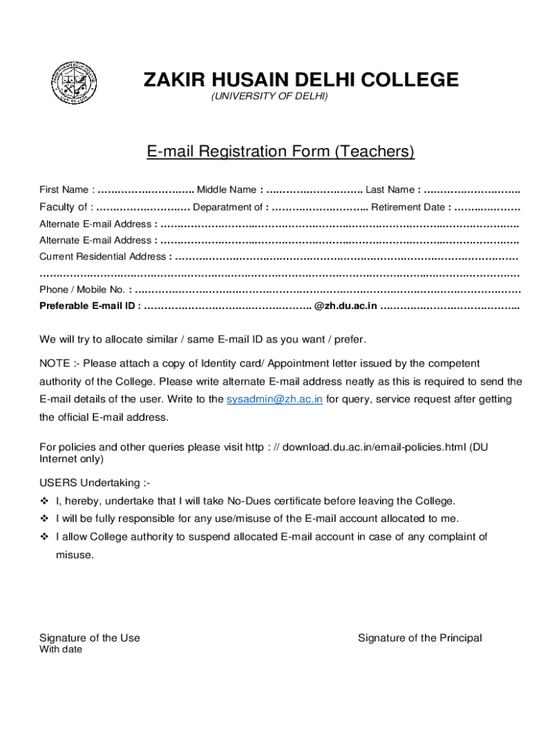 FAKIR HUSSAIN DELHI COLLEGE (UNIVERSITY OF DELHI)Email Registration Form (Teachers) First Name :. Middle Name :. Last Name :. Faculty of :. Department of :. Retirement Date :. Alternate Email Address