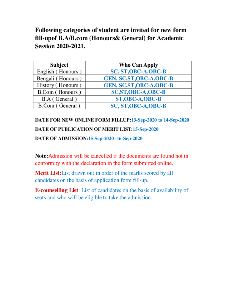 Following categories of student are invited for new form fillip B. A/B.com (Honors General) for Academic Session 20202021. Subject English (Honors) Bengali (Honors) History (Honors) B.Com (Honors)