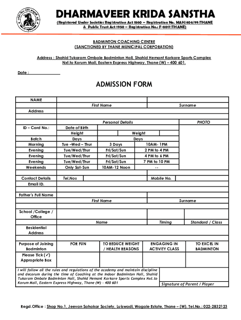 & Public Trust Act 1950 Registration No.: F8017/THANE)BADMINTON COACHING Center
