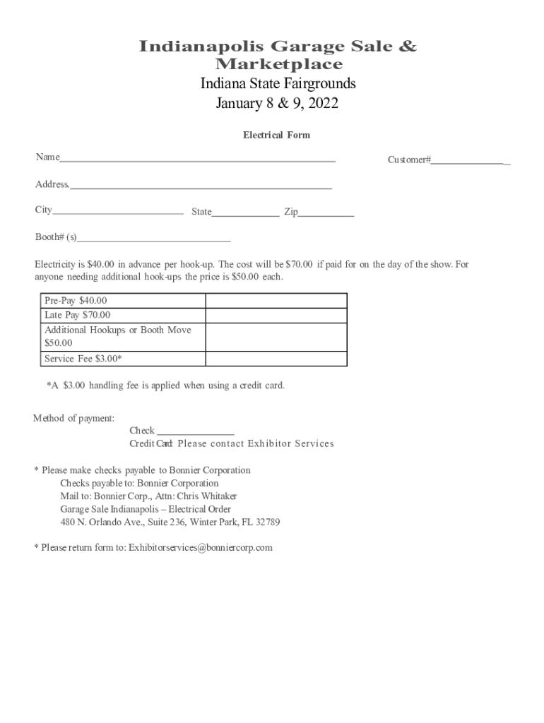 Indianapolis Garage Sale & Marketplace Indiana State Fairgrounds January 8 & 9, 2022 Electrical Form NameCustomer#Address. CityStateZipBooth# (s) Electricity is $40.00 in advance per hookup. The cost