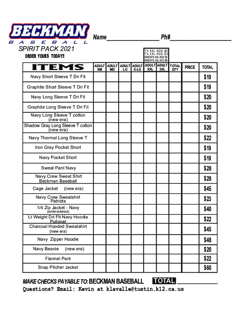 Name pH# SPIRIT PACK 2021 ORDER YOURS TODAY!! Ts XXL ADD $2 Ts 3 × L A D $3 SWEATS XXL ADD $2 SWEATS 3XL ADD $4ADULT ADULT ADULT ADULT TOTAL XXL 3XL SM MD LG XLG QTYPRICETOTALNavy Short Sleeve T