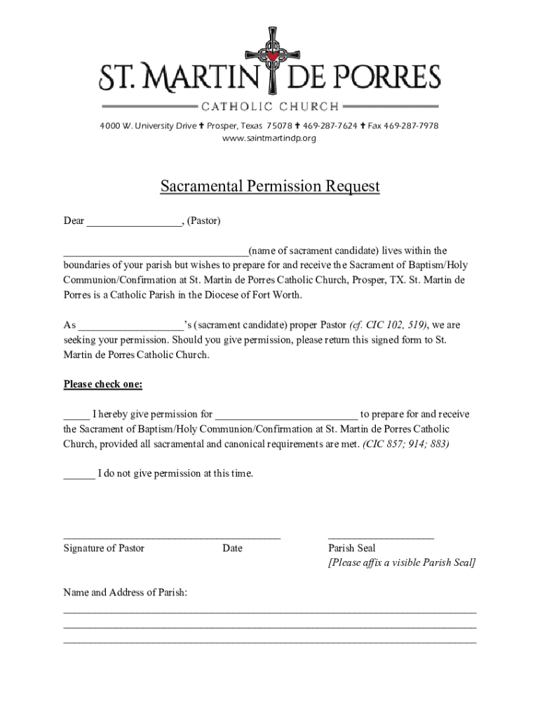 4000 W. University Drive Prosper, Texas 75078 4692877624 Fax 4692877978 www.saintmartindp.orgSacramental Permission Request Dear, (Pastor) (name of sacrament candidate) lives within the boundaries