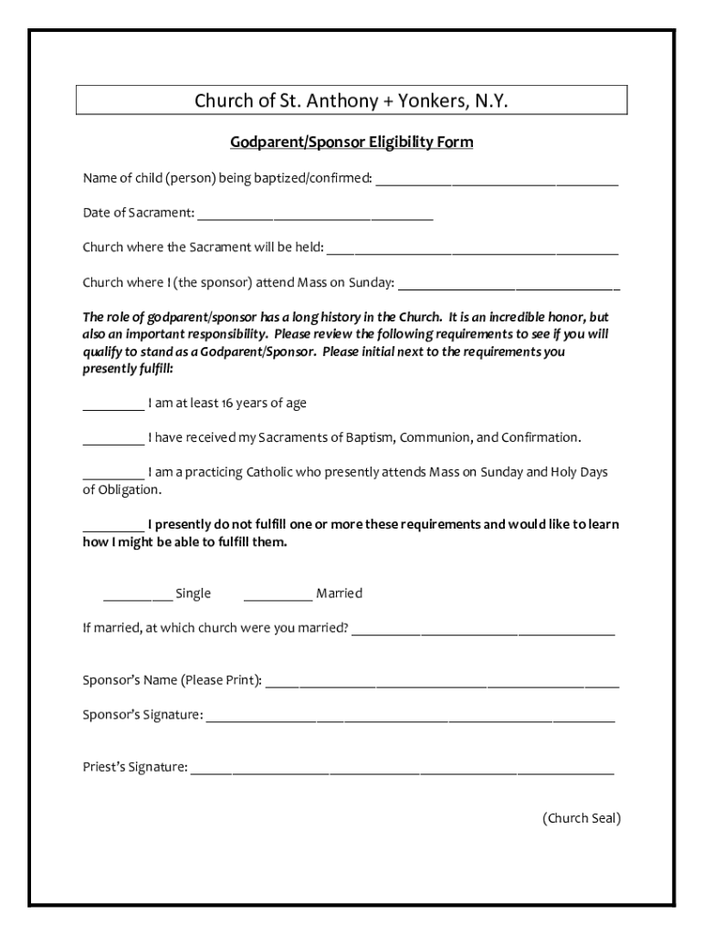 Church of St. Anthony + Yonkers, N.Y. Godparent/Sponsor Eligibility Form Name of child (person) being baptized/confirmed: Date of Sacrament: Church where the Sacrament will be held: Church where I