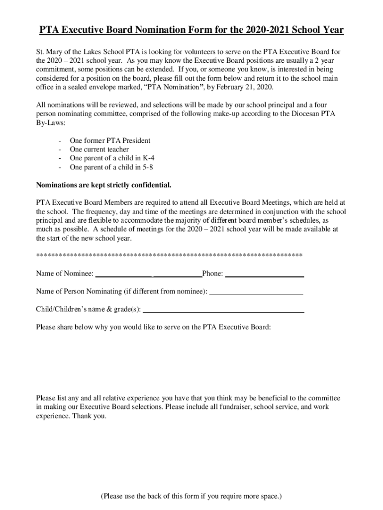 PTA Executive Board Nomination Form for the 20202021 School Year St. Mary of the Lakes School PTA is looking for volunteers to serve on the PTA Executive Board for the 2020 2021 school year. As you