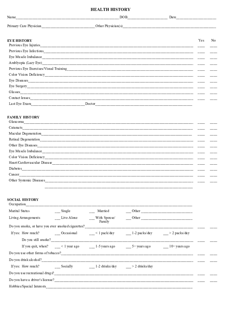 HEALTH HISTORY Name DOB Date Primary Care Physician Other Physician(s) Yes No EYE HISTORY Previous Eye Injuries Previous Eye Infections Eye Muscle Imbalance Amblyopia (Lazy Eye) Previous Eye Exercises/Visual