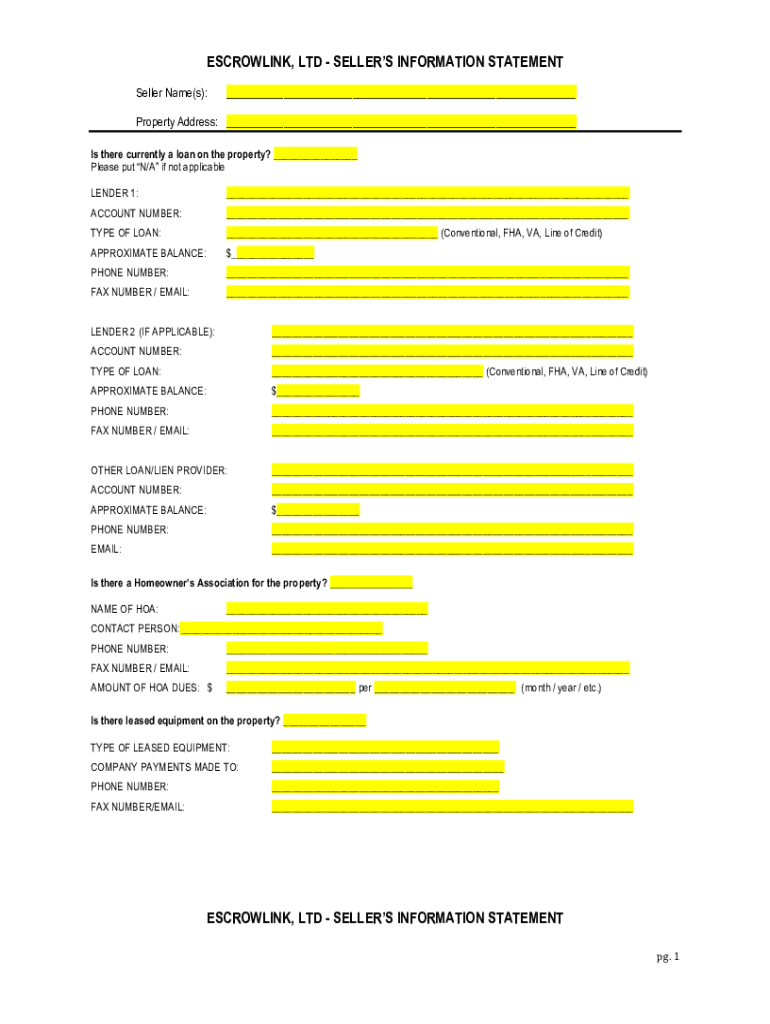 SCROLLING, LTD SELLERS INFORMATION STATEMENT Seller Name(s): Property Address: Is there currently a loan on the property? Please put N/A if not applicable LENDER 1: ACCOUNT NUMBER: TYPE OF LOAN: (Conventional,