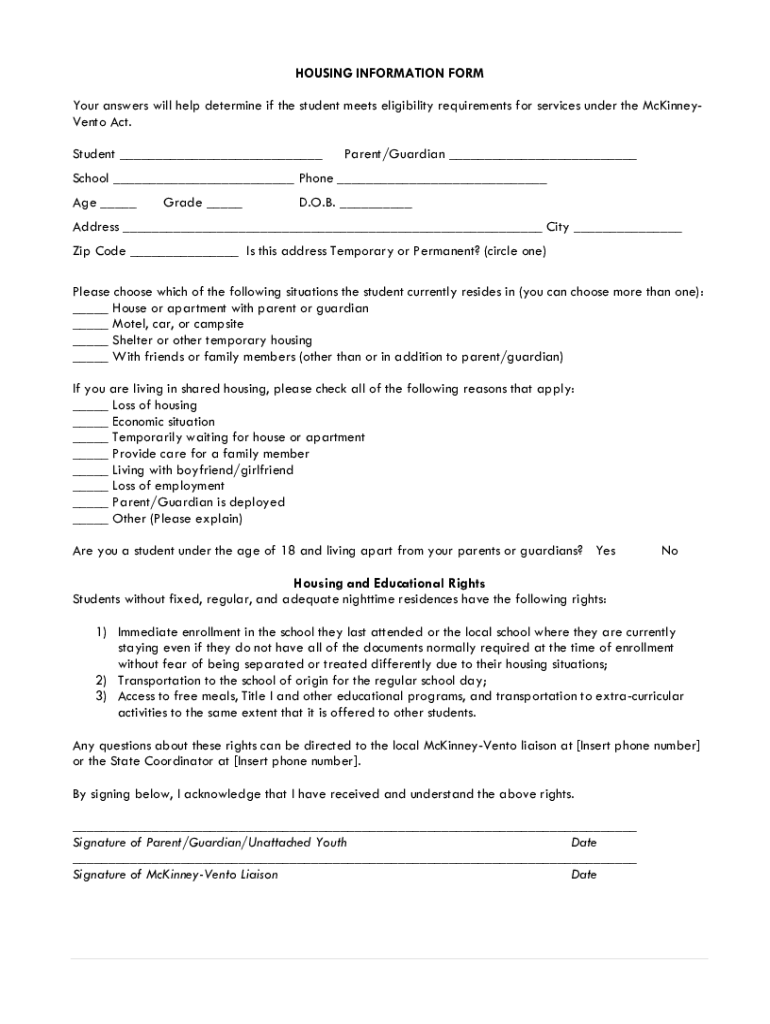 HOUSING INFORMATION Former answers will help determine if the student meets eligibility requirements for services under the McKinneyVento Act. Student Parent/Guardian School Phone Age Grade D.O.B.