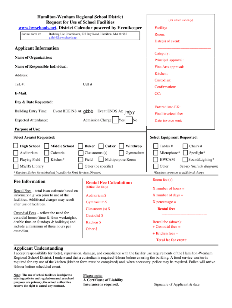 HamiltonWenham Regional School District Request for Use of School Facilities www.hwschools.net, District Calendar powered by Event keeper Submit form to:Building Use Coordinator, 775 Bay Road, Hamilton,