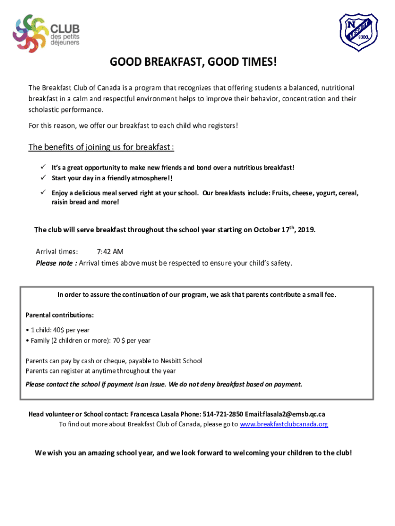 GOOD BREAKFAST, GOOD TIMES! The Breakfast Club of Canada is a program that recognizes that offering students a balanced, nutritional breakfast in a calm and respectful environment helps to improve
