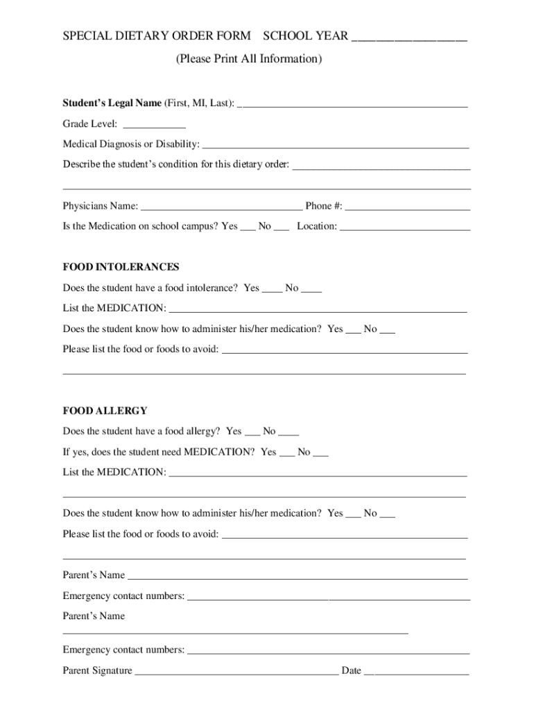 Get the free SPECIAL DIETARY ORDER FORM SCHOOL YEAR (Please ...