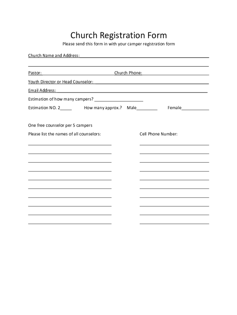 Church Registration Form Please send this form in with your camper registration form Church Name and Address: Pastor: Church Phone: Youth Director or Head Counselor: Email Address: Estimation of how