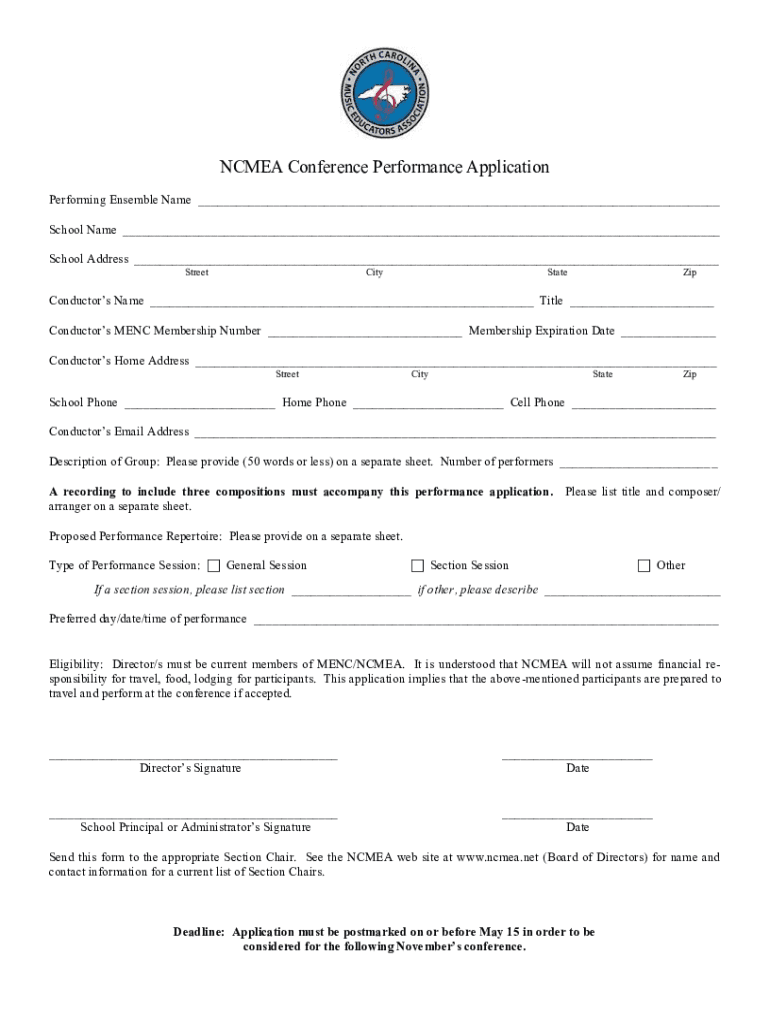 CMEA Conference Performance Application Performing Ensemble Name School Address StreetCityStateZipConductors Name Title Conductors MEN Membership Number Membership Expiration Date Conductors Home