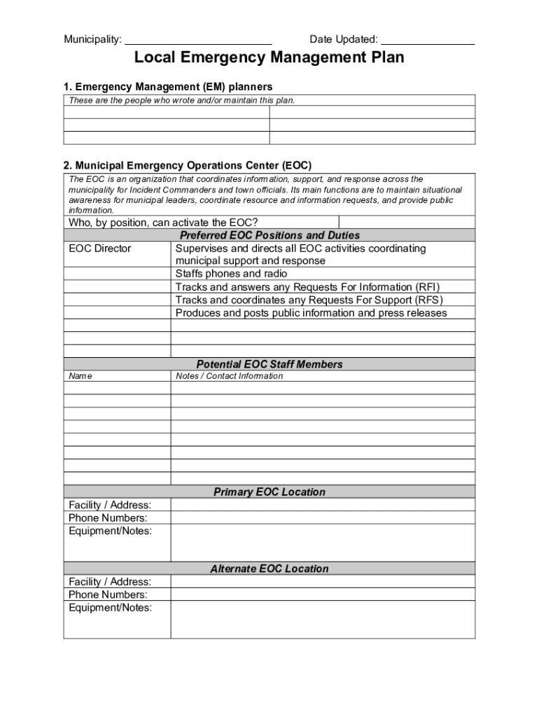 Municipality: Date Updated: Local Emergency Management Plan1. Emergency Management (EM) planners These are the people who wrote and/or maintain this plan.2. Municipal Emergency Operations Center (EOC)The